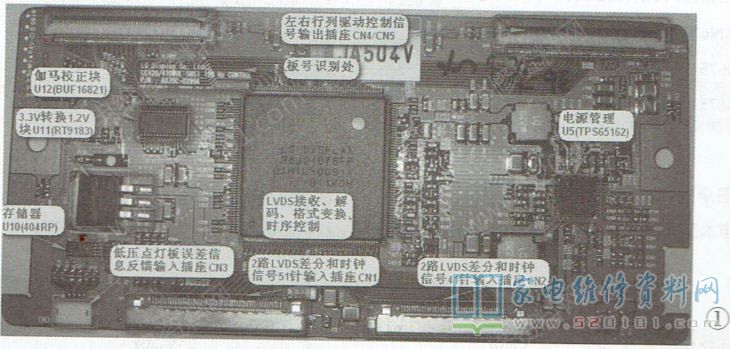 从图1可知:屏LC470WUL-SBT1(ELED)上的驱动板主要由LVDS数据接收/解码/格式变换/时序控制的核心模块UC1 (R8J01076FP)、电源管理U5 (TPS65162)、存储器U10(404RP)、DC-DC转换块U11(RT9183-12GM)、伽马校正块U12( BUF16821 )等组成。屏驱动板上插座主要脚位功能及电压说明见本期《资料》专栏。
