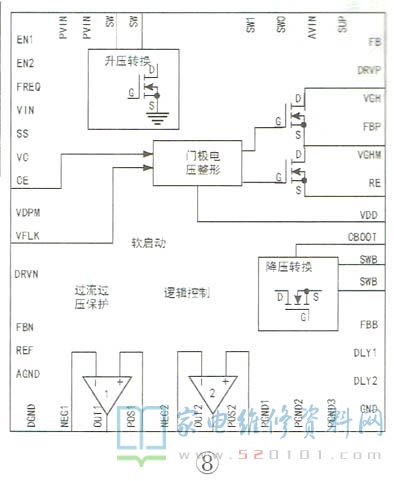 其内部框图如图8所示,其主要特点:输入电压范围8V~14.4V,软启动电路, 500kHz/750kHz固定开关频率,升压、降压转换,电流电压保护,正负电荷泵(栅极电压)VGH、VGL电压形成,内含两个高速运算放大器。