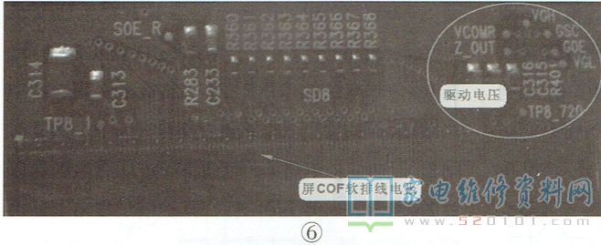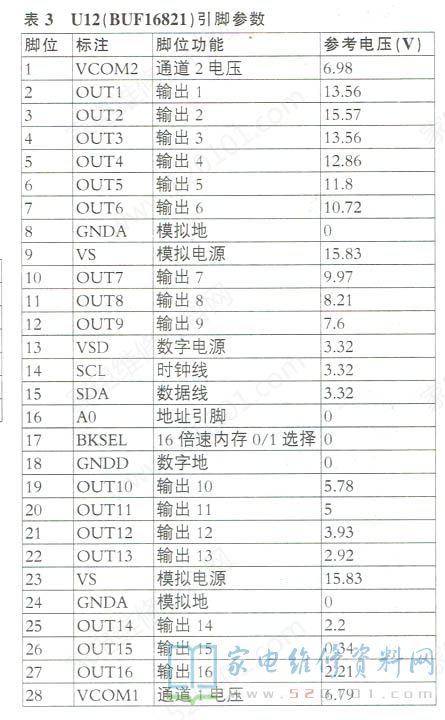 (26.91V)电压,反馈于U5的⑨脚,再从⑧脚输出VGH-M(25.53V]栅极高压,加至插座CN4的④、⑤脚和CN5的⑤、⑦脚,然后转至数据驱动模组激励cOF驱动芯片。