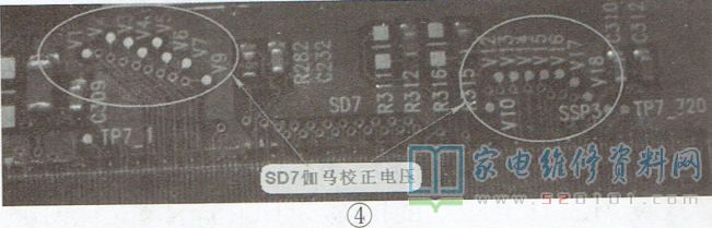 伽马校正块U12( BUF16821 )的13脚得到从电源管理块U5(TPS65162)产生的VCC(3.32V)电压后,内部开始正常工作,形成不同等级的伽马校正电压V1、V2、V4、V5、V6、V7、V8、V9,分别从U12的②、③、④、⑤、⑥、⑦、10、11输出,加至插座CN4的⑦、⑧、⑨、10、11、12、13、14脚,再转至左/右数据驱动板COF软排线中的SD2/SD7上,如图3、图4所示,而伽马校正电压V10.V11、V12、V13、14V、V15、V17、V18,分别从U1220、21、22、25、26、27脚输出,加至插座CN5的47、48、49、50、51、52、53、54脚,再转至左/右数据驱动板COF软排线中的SD2/SD7上,最终控制液晶面板,形成不同层次的灰阶,显示均匀亮度光栅。