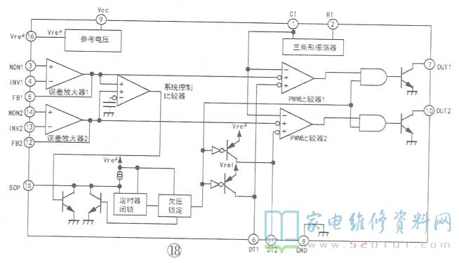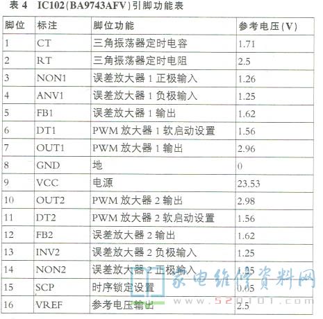BA9743AFV采用脉冲宽度调制(PWM)系统,两通道可直接进行DC-DC转换,并且内置参考电压电流、定时器闭锁、短路保护电路、防止低压输入时发生故障的电路。芯片内部结构如图18所示,电压功能参考表如表4所示。