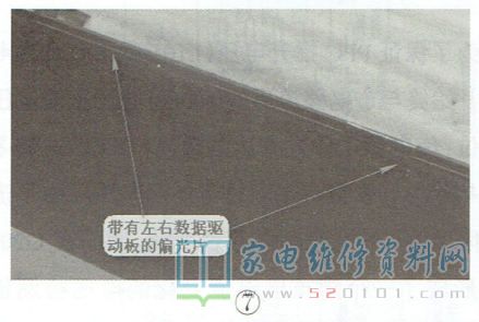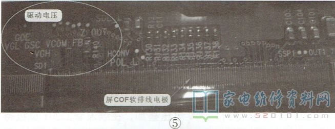 从UC1的97、98脚产生的POL(液晶分子激活电压)、SOE(源极输出使能)驱动控制信号,分别加至插座CN5的23脚/CN4的21脚、CN5的24脚,而后送入左右数据驱动板的COF处理芯片中,控制完成液晶面板的亮度显示。从UC1的的65、67、97、98脚产生的GOE(栅极输出使能)、GSC(栅极时钟脉冲)、GSP(栅极启动脉冲)、POL(液晶分子激活电压)、SOE(源极输出使能)驱动控制信号,加至插座CN4的16、18、20、21脚和插座CN5的18、20、22脚再转经左/右数据驱动板中的插座CN101/CN201,后至左/右数据驱动模组SD1和SD8的COF软排线电极(如图5、图6和带有左1右数据驱动板的偏光片图7所示),再转至左/右各4块扫描驱动模组COG(芯片封装有:移位寄存器、逻辑电路、电位转移器、缓冲放大器),通过控制垂直方向扫描的同步信号和时钟信号在移位寄存器输出状态的时间,即可循序地逐条输出开启或关闭对应扫描线的逻辑状态,加上低电位转移成高开电压或低关负电压,再加上缓冲放大器,以增大驱动能力,共同控制完成液晶面板水平方向的扫描显示。