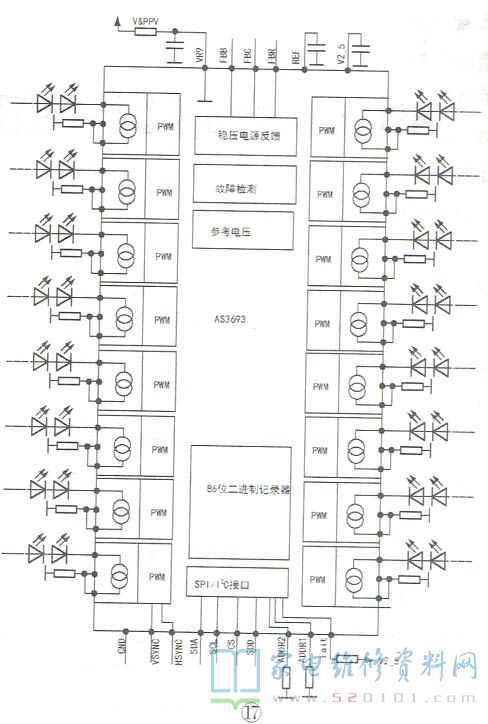 是一款16通道高精密LED内置的PWM发生器,以控制液晶面板背光驱动。当接受适当电压时,每个通道均可以通过内置的PWM发生器实现完全独立的控制,还可通过SPI/PC总线进行控制。该器件还内置有热关断及LED开路和短路控制。芯片内部结构如图17所示。