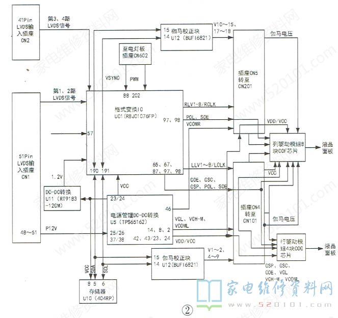 (1) 屏驱动板电压形成及信号控制处理工作原理屏驱动板电压形成:由信号主板输入的上屏电压VLCD-12V通过51Pin上屏插座CN1的48~51脚,经保险F1(3.0A/125V)得到12V电压,直接送入电源管理DC-DC转换块U5(TPS65162)的25、26、37、38脚,正常工作后,产生vcc(3.32V)电压从U5的23、24脚输出,分别加至:LVDS接收、格式变换和时序控制块UC1(R8J01076FP)的54、55、69、77、78、80、81、83、84、91、95、10、104、108、116、126、135、136、146、154、159、163、167、171、173、176、181、183、187、189、196、198、205、208脚;存储器U10( 404RP )的⑧脚;DC-DC转换块U11(RT9183-12GM)的③脚,再由U10三端稳压形成1.2V 电压加至UC1的59、71、81、93、161、169、185、194脚;插座CN4的53、54脚和CN5的⑦、⑧脚,而后转至左右数据驱动板CN101的⑦、⑧脚和CN201的53、54脚。