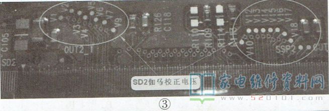 在测试电压之前,首先将屏置于自检状态,具体方法是:拔掉驱动板2路上屏插座CN1/CN2(51pin/41pin)LVDS线,直接取上屏电压12V加至驱动板上的保险F1,在上屏51pin插座中的④脚(即R127一端接Uc1的⑦脚)接3.3V电压,作为芯片测试电压;另再给低压背光驱动板上插座CN101的①~⑤脚加上24V电压、⑥~10脚接地线12脚(ON/OFF )开关控制接5V电压和13脚(Vbr-B)亮度控制接3.3V电压,若屏及组件正常的话,插上交流电二次开机,屏幕会出现循环单色画面。