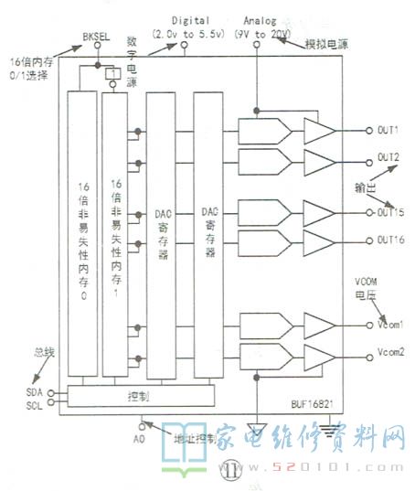 特点:10bit分辨率,提供16通道可编程伽马电压和2通道可编程vCOM电压,16倍速可擦写非易失性内存,模拟电源范围9V~20V,数字电源范围2V~5.5V。其内部框图如图11所示,引脚参数如表3所示。