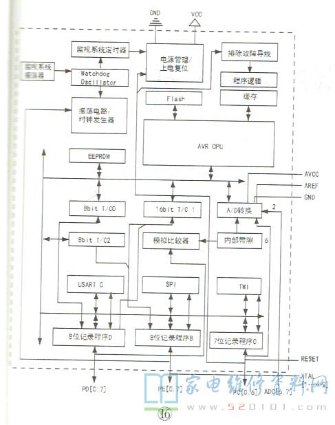 该IC是一款高性能、低能耗的8位微控制器,内置32X8通用工作寄存器、一个16位定时器及独立分频器等,内部结构如图16所示。