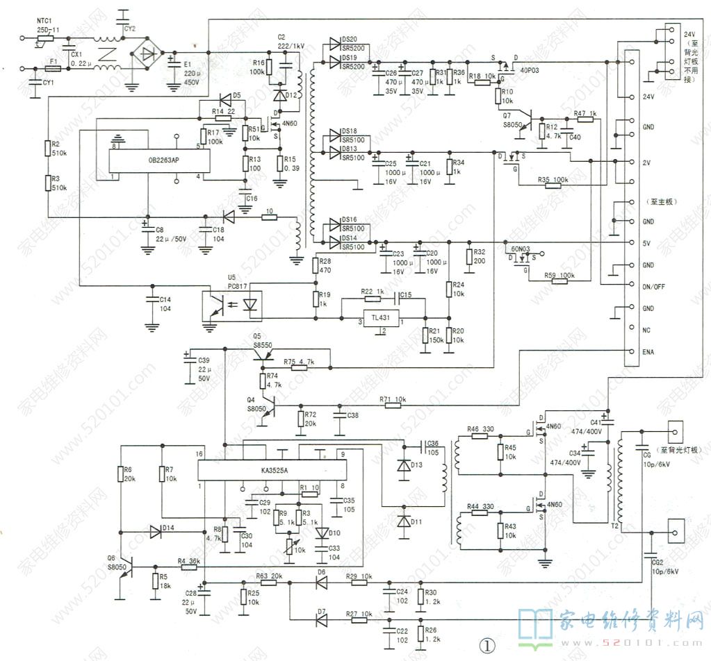 该机水平安置有8根U形灯管,灯管的插头位于右边,而左边是灯管的中段位置。根据经验,灯管老化或供电电压偏低都可能引起灯管中段亮度偏低。该板的升压电路以KA3525A为核心组成。KA3525A①脚输入灯管电压监测信号(变压器T2输出的高压经电容CG、CG2和R29 R30,R26、R27分压,D6、D7整流,R63.R25分压,C28滤波后获得),②脚输入基准电压(16脚输出的5V电压经R7和R8分压获得),⑨脚输出对①脚、②脚输入信号比较后的控制信号,控制芯片内部PWM电路,以改变11脚和14脚输出的PWM信号脉宽,使灯管电压恒定。KA3525A⑥脚外接可调电阻,调节该电阻可以调整芯片的振荡频率。试着调节,光栅亮度变化不明显,查资料得知,改变KA3525A②脚基准电压可使⑨脚电压升高,最终使灯管电压提高。试着断开②脚外接电阻R8,对地接-只50k可调电阻,调整该可调电阻,②脚电压可以在1.6V~3.5V之间变化,但⑨脚电压无明显变化,灯管亮度也基本没有变化。查看线路,发现电源高压一体板输出的24V电压送往灯板上插座CON4。