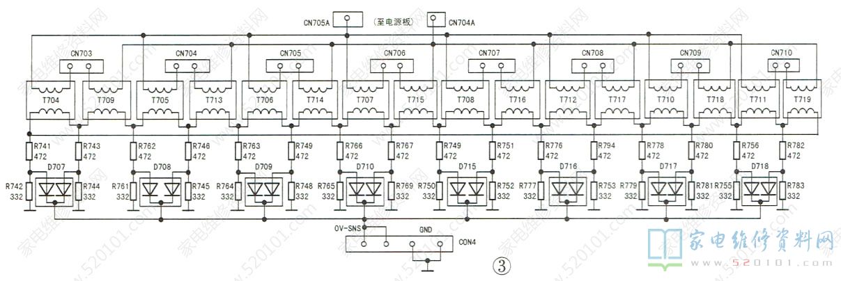 实测该机灯板电路如图3所示,CON4中的OV-SNS端是灯管电流检测输出端。经过试验,KKK-50DD型板可以不连接CON4。怀疑灯板性能不良导致高压不足,但代换灯板后故障依旧。