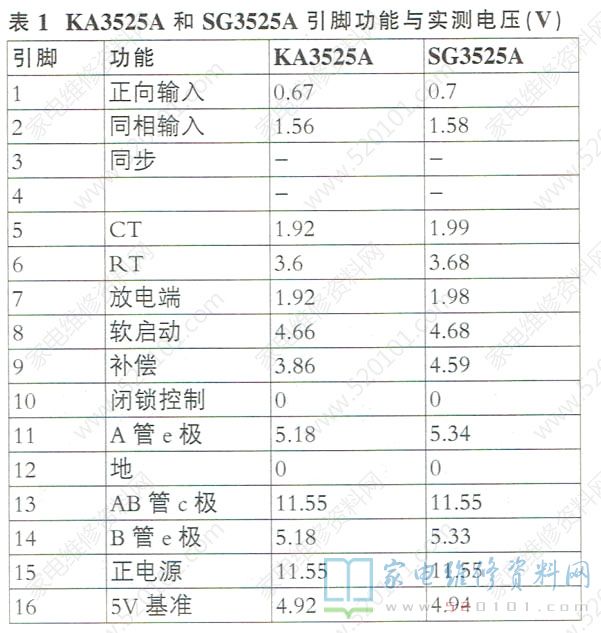 根据经验,CBB电容在高温高电压下易容量下降。拆下CBB电容C41、C34检测,一只降为464nF,另一只降为330nF。将这两只电容换新后试机,灯管亮度仍无明显变化,怀疑KA3525A性能劣化,换上ST公司生产的正品SG3525A后,光栅亮度变化明显,此时测SG3525A⑨脚电压已经由原先的3.8V升为4.1V ;调整⑥脚外接的可调电阻时,背光亮度变化明显,直到调整到屏幕左右亮度差不多时为止。至此,故障排除。实测KA3525A和SG3525A的引脚电压见表1,供参考。
