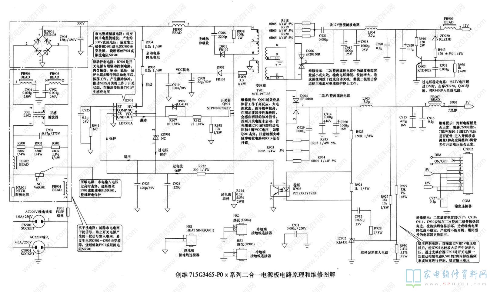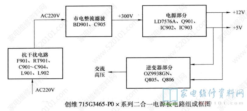 该系列二合一电源板由开关电源和背光灯逆变器两部分组成。开关电源:以驱动控制电路LD7576A (IC901) 和大功率MOSFET (开关管) Q901 为核心组成主开关电源,产生12V、5V电压,为主板和背光灯供电电路供电。开关电源部分只有一个 主电源电路,没有PFC电路和副电源,电路简洁,工作可靠。开关机电路不对开关电源进行控制,但对电源板上的背光灯供电电路进行开启/关闭和亮度调整控制。