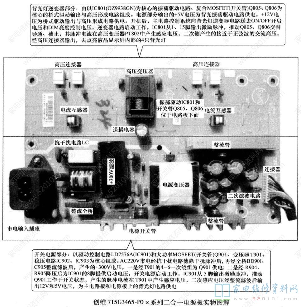 创维液晶彩电采用的715C3465-P0 xx系列电源板,为开关电源与背光灯供电电路合二为一的电路板,常见型号有715G3465-P01-0HV-001S、715G3465-P02-003M、715G3465-P02-0HV-001M。这三种电源板电路结构基本相同,应用于创维19S19IW、24S19IW、22S19IW等小屏幕液晶彩电中,22in液晶彩电配TPT216B1-L01显示屏,24in液晶彩电配M236H-L01显示屏。创维715G3465-P0 x系列二合一电源板实物图解如图1所示;电路组成框图如图2所示。