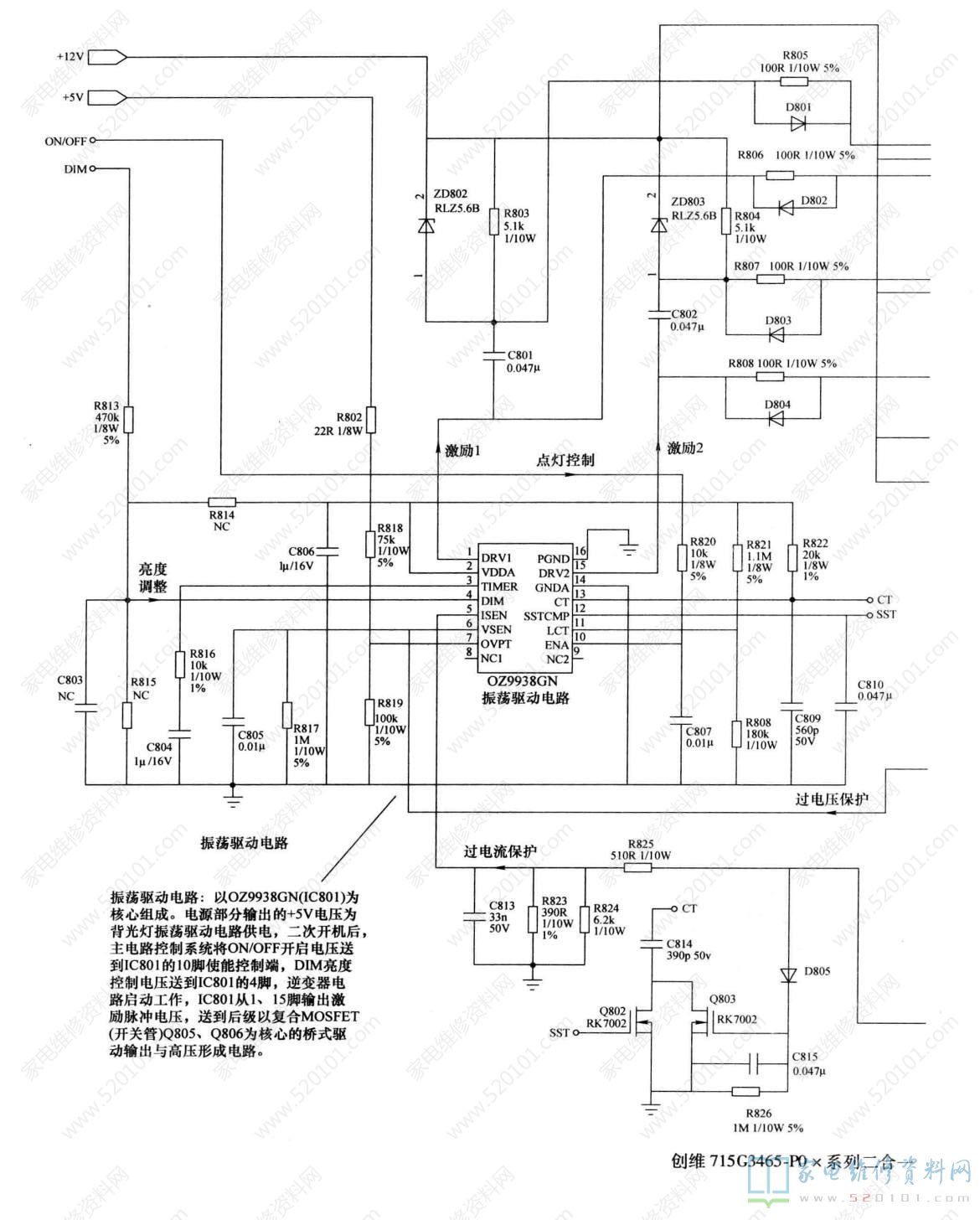 通电后开关电源即启动工作,向主板和背光灯供电电路提供12V、5V电压。背光灯逆变器:由以IC801 (OZ9938GN) 为核心的振荡驱动电路、复合MOSFET (开关管) Q805 、Q806为核心的桥式驱动输出与高压形成电路组成。电源部分输出的+5V电压为背光灯振荡驱动控制电路供电,+12V电压为桥式驱动输出与高压形成电路供电。开机后,主电路控制系统向背光灯逆变器电路送去ON/OFF开启电压和DIM亮度控制电压,逆变器电路启动工作,将+ 12V直流电压转换为接近于正弦波的交流高压,去点亮液晶显示屏内部的4只背光灯。