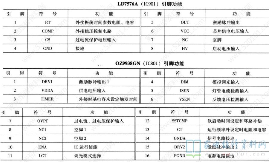 过电压检测保护: 一是PT802输出的高压,经C816、C823、 R827、 R831、 R832 和C824、C825 、R833、R834、 R835 分压后,经过D806整流产生检测电压,送到0Z9938GN的6脚;二是CN801CN804的2脚灯管电流回路产生LV1 ~ LV4检测电压,经D807、D808整流后也送到0Z9938CN的6脚。当检测电压超过保护设定值时,IC内部保护电路启动,切断1、15脚的激励脉冲。该电源板的集成电路引脚功能见表1~表2。