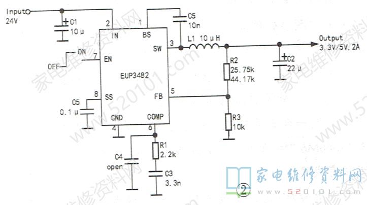 EUP3482的典型应用电路如图2所示,其引脚功能如下:①脚(BS)为自举升压端,在BS端与SW端之间接一只10nF的电容;②脚(IN)为输入电压供应端;③脚(SW )为开/关输出端;④脚(GND)接地;⑤脚(FB)为反馈输入端;⑥脚(COMP)为控制电路补偿端;⑦脚(EN)为IC使能输入端(高电平时IC正常工作,低电平时IC不工作);⑧脚(SS )为软启动端(若悬空,IC不能软启动;当通过电容连接到地时,IC可以软启动)。