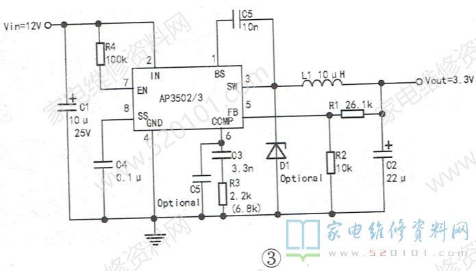 测得U6的②脚供电电压及⑦脚使能电压均正常,怀疑芯片损坏。笔者手头没有该型号芯片,但发现一块长虹主板上用的DC-DC芯片AP3502,与EUP3482的引脚定义差不多,见图3。于是换上AP3502试机,L8后端输出1.3V电压,电源指示灯亮;输入信号,图像、声音均正常。蓝底白字的创维LOGO也出现了。
