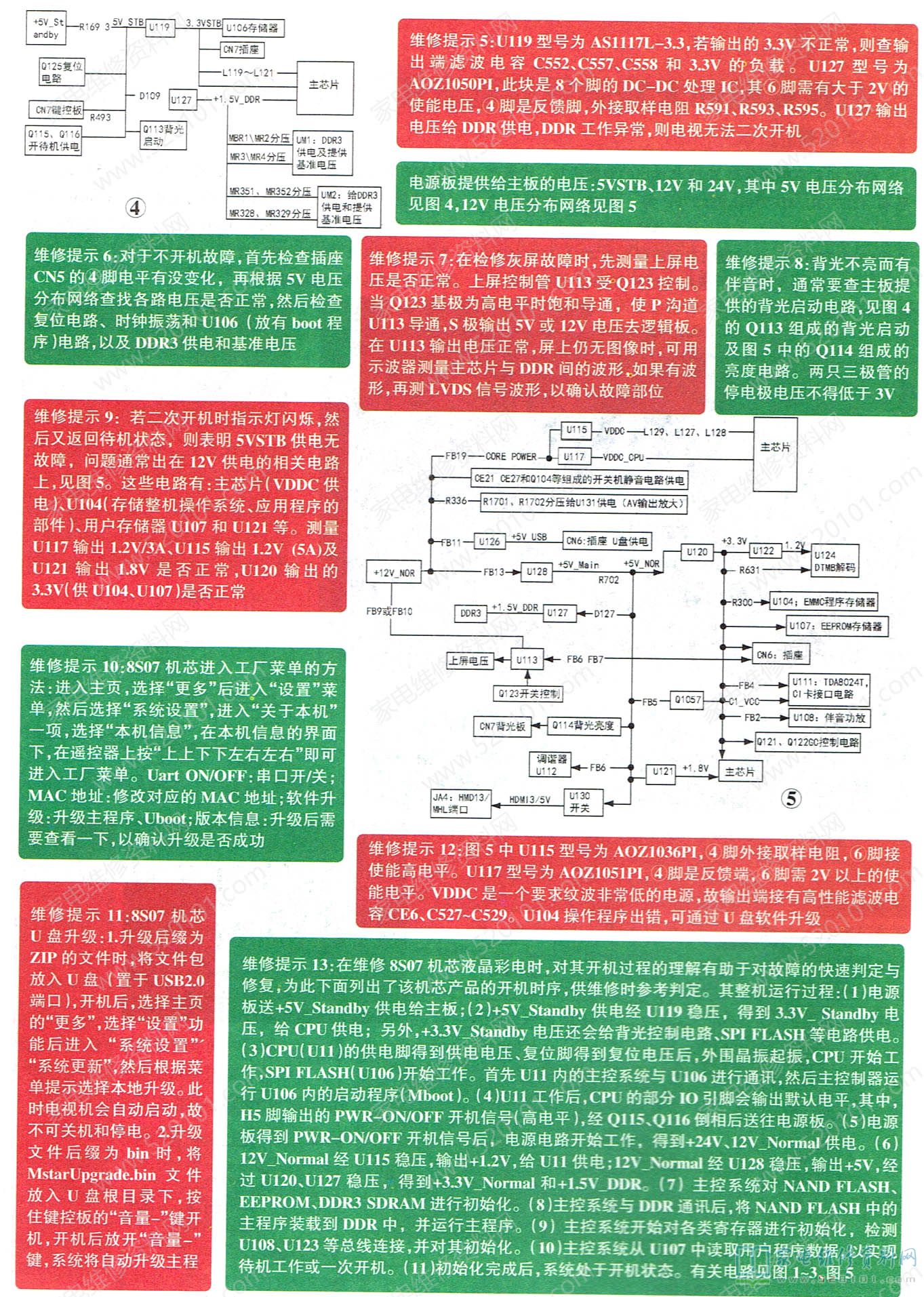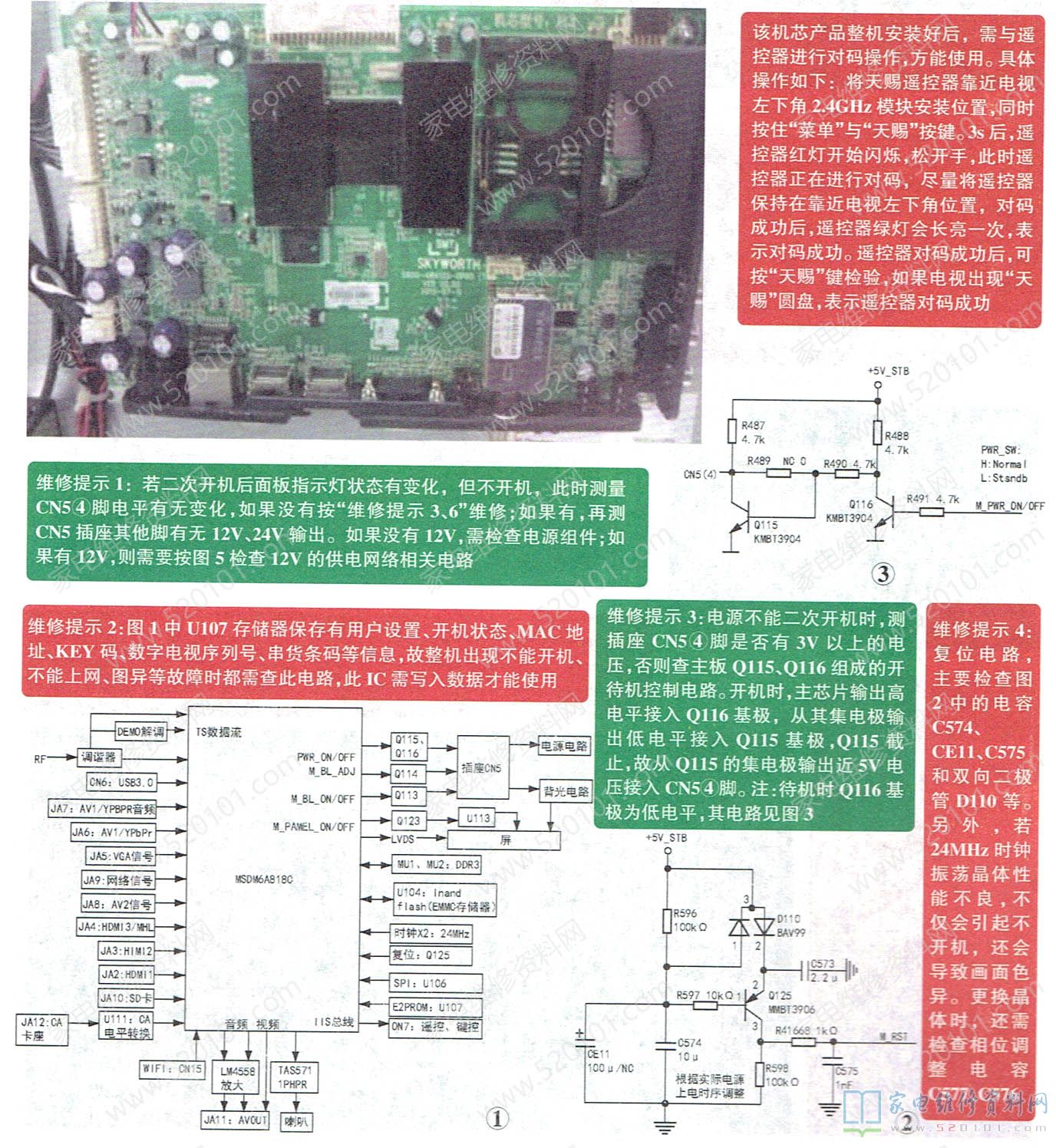 创维8S07机芯系创维公司2013年推出的智能机芯,代表产品有42E770U、47E770U、55E770U等,其主芯片型号为MSD6A818QVC( CPU+GPU+数字伴音处理),伴音功放型号为TAS5711PHPR,动态随机存储器型号为4711-H5T4G2-0960 (156M*16bit,DDR3, 运行主时钟频率达1866MHz),EMMC程序存储器采用东芝研发的THGBMSGSA1JBAIR(存储量5GB)。控制系统CPU采用四核ARM cortex-A7CPU,主频最高1.2GHz.9.0G DMIPS;数字图像处理GPU为四核ARM Mali-450 GPU@400MHz, 可支持4GBDDR3。机芯信号流程见图1。