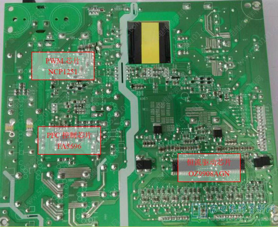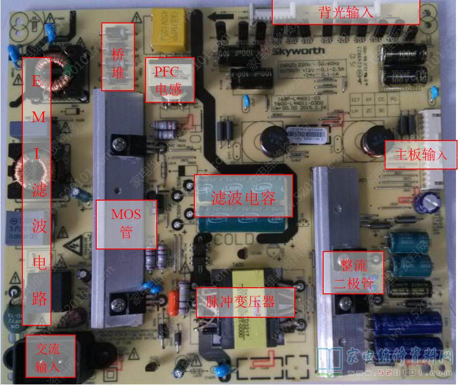 创维49英寸液晶电视采用的电源型号为168P-L4N011-03,该板采用电源恒流二合一方案,其中电源部分有PFC电路,无副电源电路,采用NCP1251单芯片方案,恒流驱动部分。本电源板电路大致由三大部分组成:1、EMI及桥式整流滤波电路;2、PWM控制与功率输出电路;3、恒流驱动电路。
