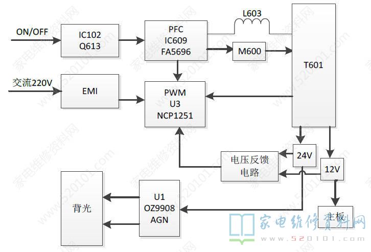 创维49E6200电视采用板号为168P-L4N011-03的电源电路,其系统结构框图如下: