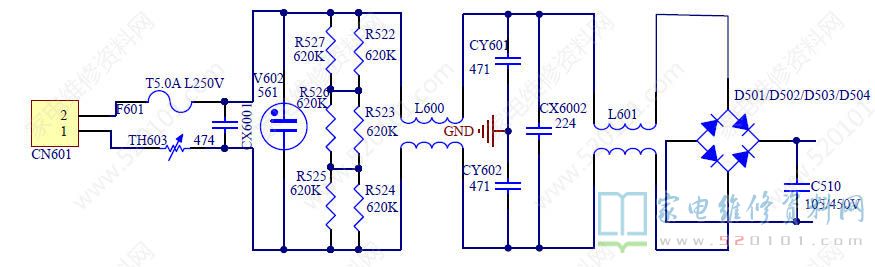 其EMI整流滤波电路如下图所示,F601 是保险丝,TH603 是限流电阻,V602 是压敏电阻,CY601、CY602 是共模滤波电容,L600、L6001 是共模电感,CX6001、CX6002 是差模电容,R522-R527 是泄放电阻。市电经EMI 滤波电路滤波,送往D501、D502、D503、D504、C510 组成的桥式整流滤波电路进行整流、滤波。