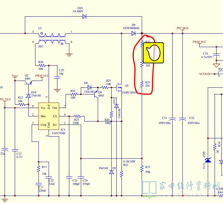 接修一台同行转来的创维42E82RD液晶电视,采用的是8K88机芯,故障现象黄灯亮不开机,同行说是更换过电源板了已经,开机测量电源板5V电压正常,开机电压3.5V也正常,电源板没有12V和24V电压输出,测量PFC电压为312V不正常,显然PFC电路没有工作,单独拆下电源板维修,开机脚接5V电压,测量PFC电压仍然是320V, 显然PFC电路没有工作,测量PFC2M取样电阻其中一个已经开路,更换后测量PFC电压385V正常,故障修复。
