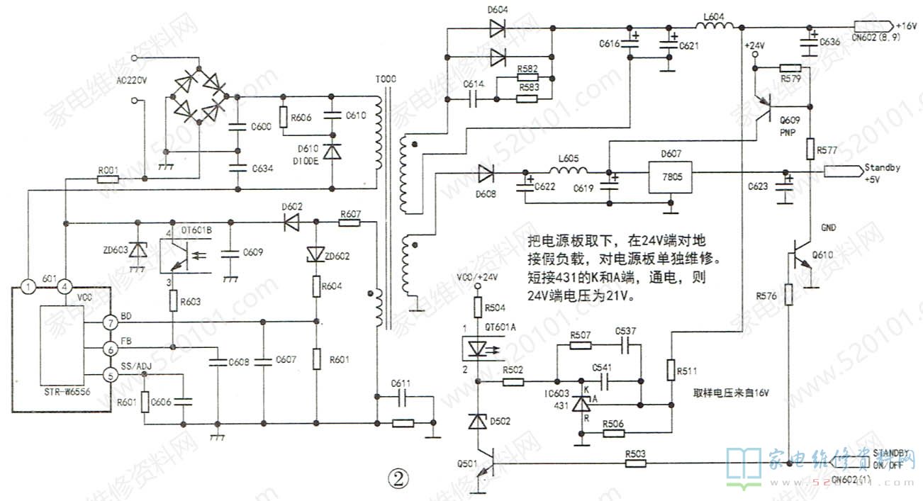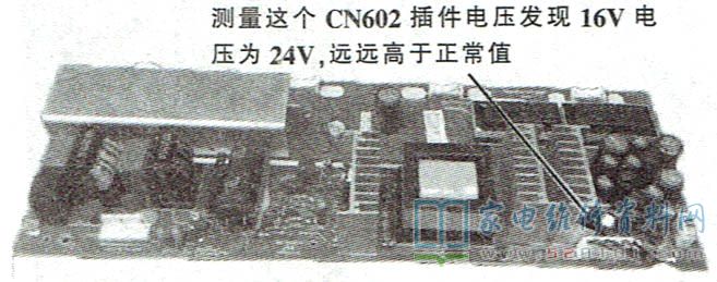 接修一台创维26英寸液晶电视,近来总是自动关机,现在只要放半个小时就自动关机了。通电,发现有正常图像声音,试机不到半小时自动关机。打开后盖,开机通电准备检测,-直收看两三个小时没有出现故障,就没有用表进行电压检测。连续收看半天,正常。无奈只好把后盖合上,通电,不到半小时关机。这时打开后盖进行电压检测。该机采用电源背光二合一板,型号是P26TQM,检测插件CN602,发现⑧、⑨脚电压为24V,正常应为16V;检查24V,发现电压为35V,导致这些电压偏高的部位有:取样电路、稳压电路、R511、R506、IC603(TL431)、光耦OT601,一直到STR-W6556反馈引脚⑥脚FB。相关实物标注见图1。
