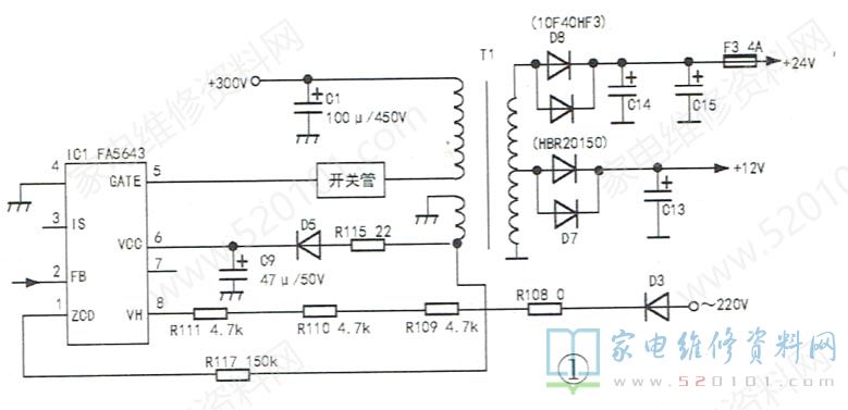 接修一台创维32E350D型液晶电视(A8M410机芯),开机后出现蓝屏并显示“创维”标识后黑屏,几秒后自动重启,并重复上述现象。开盖,测量电源板(板号5800-P32EXM-0500)输出插座CN2处12V、24V电压在屏亮后均下降:12V降至9V,24V降至16V,判断电源带负载能力不足或者LED灯条短路引起保护。先在输出电压滤波电容上并接电容,无效。用自制电压检测仪逐一测5组LED灯条,都可以正常点亮而且电压值基本一致,基本排除灯条异常的可能。为准确判断,断开恒流电路的24V供电贴片保险F3,外接24V/2A的电源,开机,图、声正常,由此确定故障在以IC1(FA5643)为中心的电源电路。因空载电压正常,分析电源IC1稳压、反馈正常,重点检测次级电路,如图1所示。代换电容C9、C13、C14、C15无效;检测12V、24V整流管D7、D8(均为肖特基二极管HBR20150)均正常。