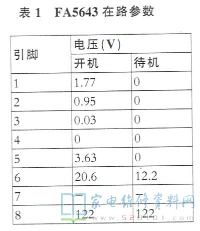 该机电源芯片为FA5643 (IC1),其⑥脚(VCC)正常时电压为11V~26V。电源启动时,启动电路通过⑧脚给⑥脚外接电容充电,⑥脚电压开始上升,当该电压超过阈值电压14V时(FA5642芯片的启动阈值为10V),IC开始运行。如果此时由开关变压器辅助绕组提供的电压高于9V,则⑥脚改由辅助绕组供电;如果此时辅助绕组提供的电压低于9V,则启动电路反复开启/关断。由此看来,IC1的⑥脚是检测重点。上电,测得IC1的⑥脚电压在9V左右波动,这说明辅助供电异常,经查贴片电阻R115(22Ω)已开路,换新后故障排除。正常工作时,IC1的各脚电压见表1。