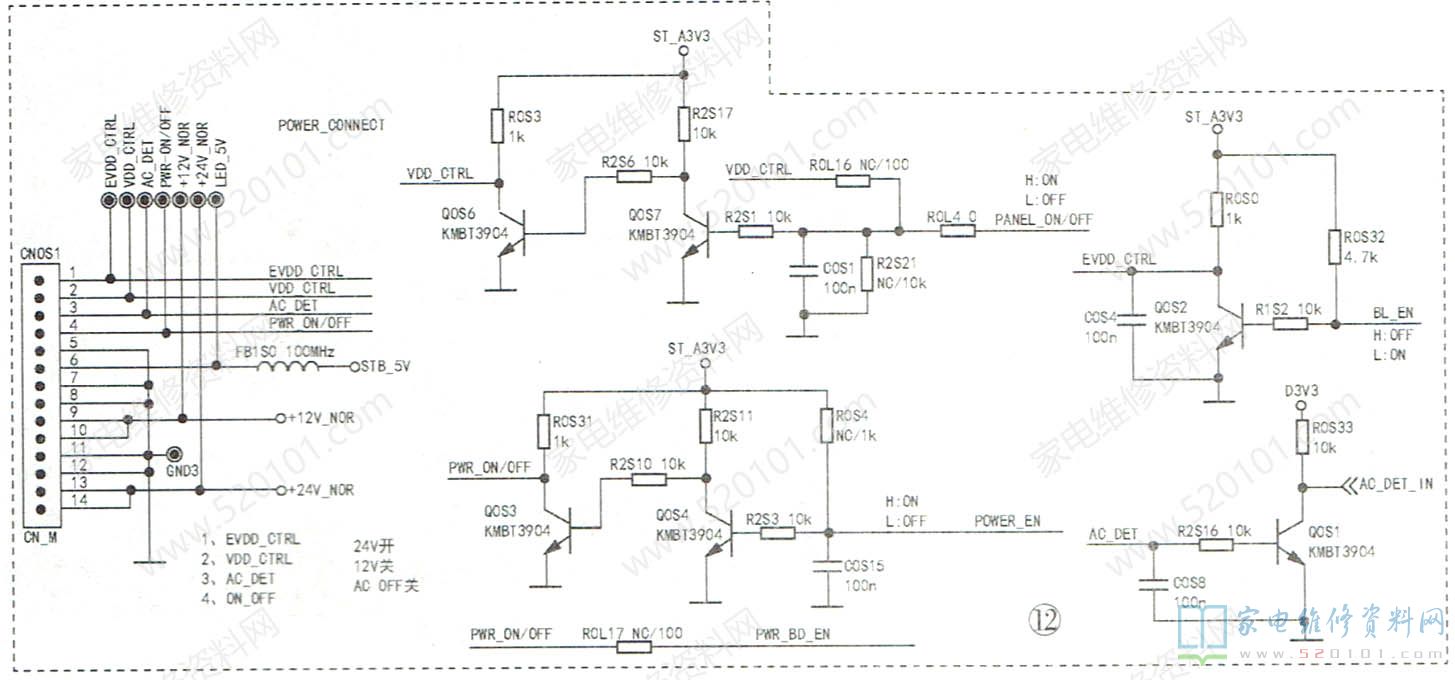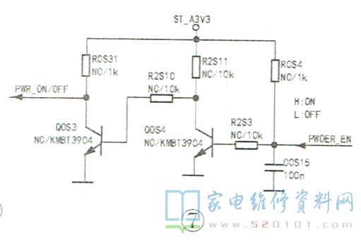 Q0S3、Q0S4及其外围元件组成待机电路,如图7所示,在正常开机时,主芯片中的CPU的待机控制脚输出Power EN开机信号(高电平),经Q0S3、Q0S4倒相,送给电源板PWR ON/OFF开机信号(高电平),电源电路输出PWR 12V、+24V供电。在待机时,CPU输出低电平经90S3、Q0S4倒相,送给电源板低电平,电源电路进入低功耗输出状态,输出的12V电压经变换得到D3V3、A3V3电压,经主芯片、EMMC、EEPROM等电路供电,以维持待机。