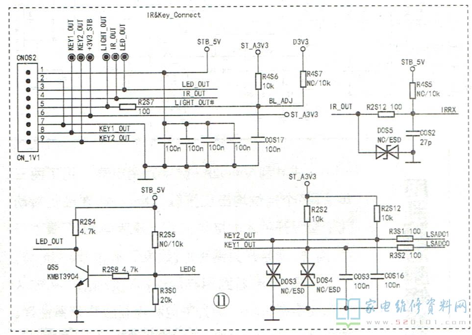 副板接口电路如图11所示,该电路采用标准电路设计与其他机器都能通用,具备插杆键控和触摸功能,且具备呼吸灯效果,LEDG经反向电路反转为LED_ oUT控制指示灯,开机启动后LEDG为低电平,CNOS2 PIN3为高电平,此时指示灯为红灯,启动后,根据待机(红灯)或开机(绿灯)状态由LEDG给出对应电平。