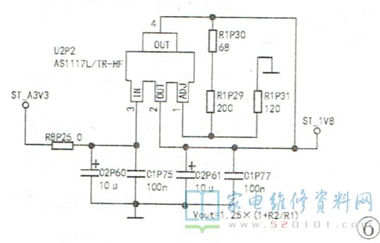 U0P2送过来的ST_3.3V经U2P2 (AS1117L)稳压,得到ST_1V8供电,如图6所示,用做CMMC电路的工作供电。