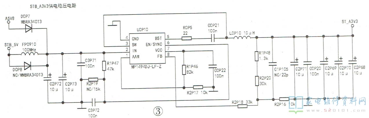 1.STB_A3V3供电稳压电路副电源电路送来的STB5V供电经稳压电路U0P10(MP1494D-LF-Z)稳压,得到STB_A3V3供电,如图3所示,给U20(RTD2999)中的待机CPU供电。