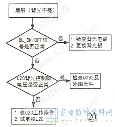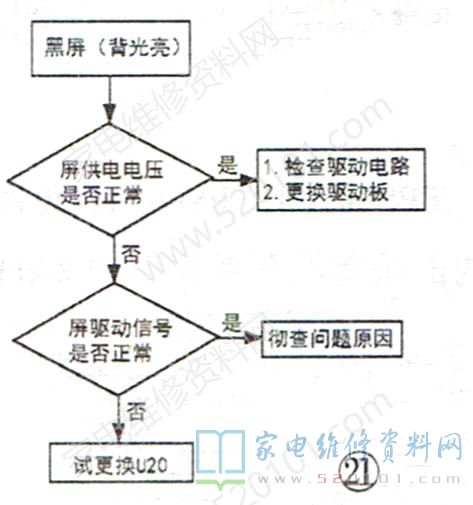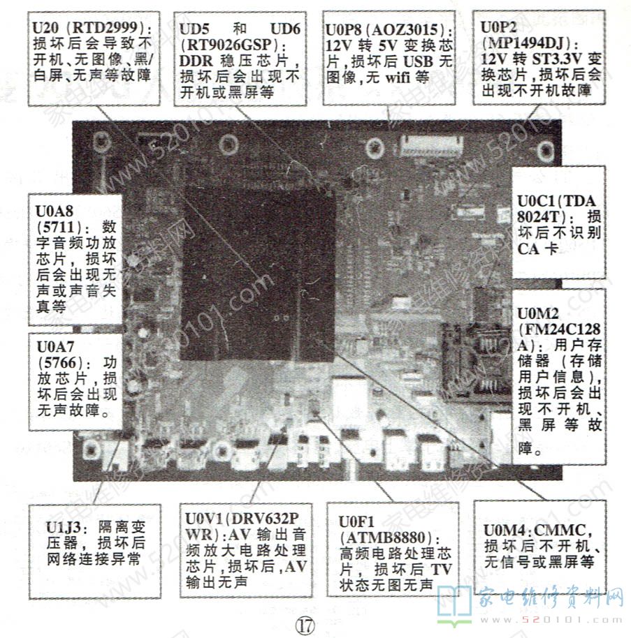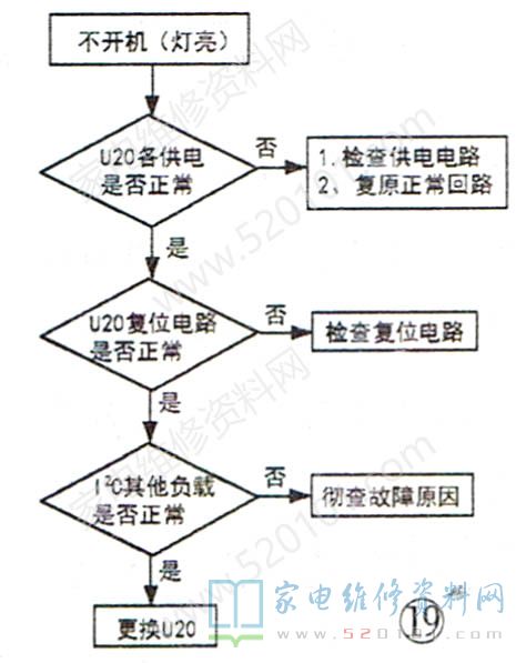 该机芯彩电主板主要IC的常见故障分析如图17所示,不开机、黑屏等故障的检修流程如图18~图21所示。
