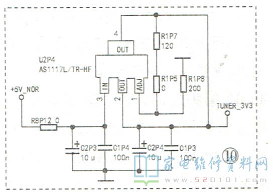 电源板产生的+12V NOR供电,经UOP8得到+5V_NOR,再经U2P4稳压得到TUNERD3V3,如图10所示,给高频电路供电。