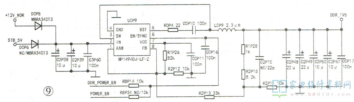 7. DDR 1V5供电产生电路在正常开机时,使能控制信号送到UOP9的⑥脚,内部电路工作,于是12V_NOR供电经UOP9(MP1495Dj-LF-Z)为核心的DC-DC电路变换,得到1.5V,如图9所示,给DDR的内核电路供电。