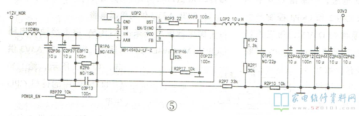 3.D3V3供电产生电路电源板送来的+12V_NOR供电经UOP2(MP1494DJ)稳压,得到D3V3供电,如图5所示,给U20中的CPU、EMMC、RTD2998等相关电路工作供电。
