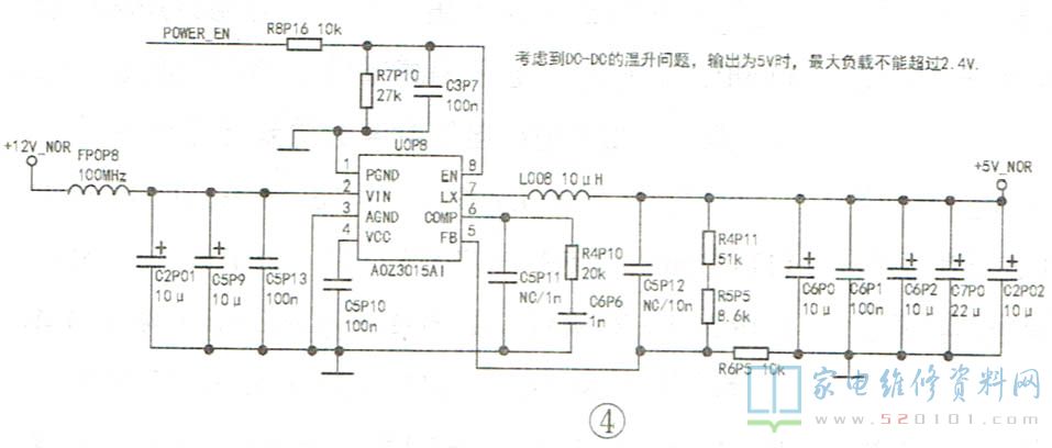 电源板送来的+12V_NOR供电经UOPS(AOZ3015AI)稳压,得到+5V_NOR供电,如图4所示,用作不同电路的输入供电。