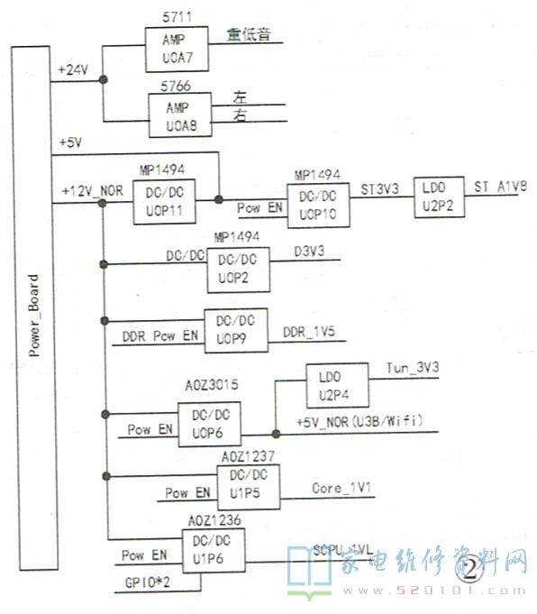 电源板送+5V_STB供电给主板,+5V_STB经U1PO得到+3.3V_STB,给CPU供电。CPU正常工作后,电源板得到PWR-ON/OFF开机信号,电源板输出+24V_NOR、+12V_NOR供电。+12V_NOR经UOP2稳压得到ST_A3V3电压,一路给U20中的CPU供电,第二路经过QOP2和Q0P3控制产生D3V3 (POWER EN信号控制D3V3),第三路经U2P2转换得到STA 1V8, 然后经Q0P6、Q0P7控制产生D1V8(POWER EN信号控制D1V8的通断)。+12V_NOR一路经U0P6稳压得到+5V_NOR电压,经U2P4转换得到Tun,3V3,为高频头供电;另一路经UOP9稳压得到DDR1V5电压,为DDR供电;第三路经U1P5稳压得到Core_1V1电压,为主芯片内核供电。24V给数字音频功放U0A7、U0A8供电。U0P8输出电压若超过5.4V,可能会烧坏硬盘。U09P、U1P6输出电压偏高或偏低会导致死机、花屏等故障。U2P4输出电压异常会导致无法搜台。