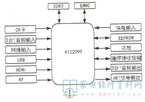 U20Z (RTD2999) 为主芯片:UD1~UD4(H5TQ6G63CFR -TEC)为DDR3-2133MHz SDRAM;U0M4 (THGBMFG7CILBAIL)为EMMC存储芯片(16G Bytes CMMC FLASH用于存储启动程序);UOM2(FM24C128A)为EEPROM程序存储器。