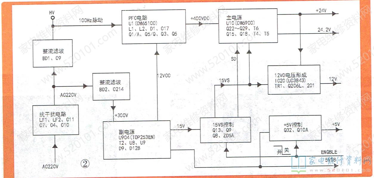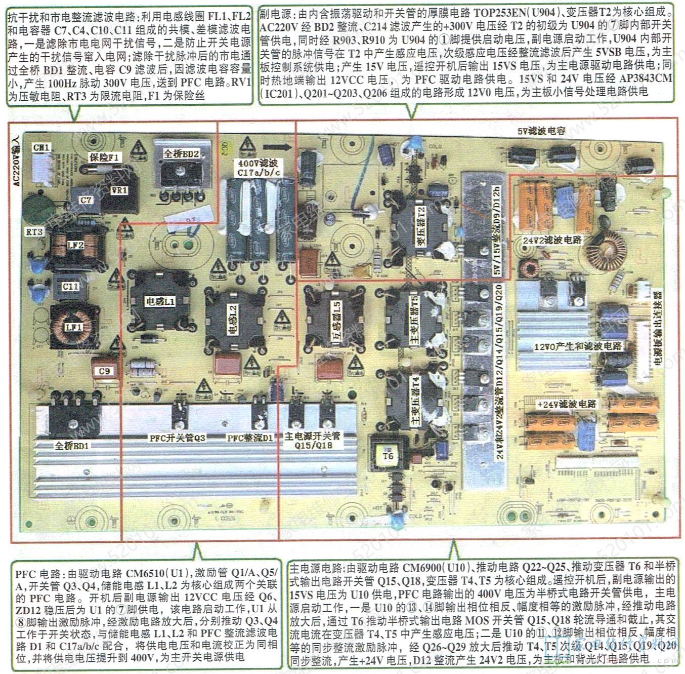 创维大屏幕LED液晶彩电采用的5800-P5STQC 00X0电源板,型号尾缀有0010、0200、0300、0400、0500、0700,型号又称为168P-P55TQC-00,集成电路采用CM6510A+CM690+TOP253EN+UC3843组合方案输出5V3A、24V/6A、24V/1.5A、12V/5A电压。5V/3A电压为主板控制系统和信号处理电路供电;24V/6A为背光灯电路供电:24V/1.A为伴音功放电路供电;12V/5A为小信号处理电路供电。应用于采用55LED10-8K81和55LEDIX 8M182模块组成的5SE60HR、5LED10等大屏幕创维LED液晶彩电中。创维5800-P55TQC 00X0电源板实物图解见图1所示,电源板电路组成方框图见图2所示。