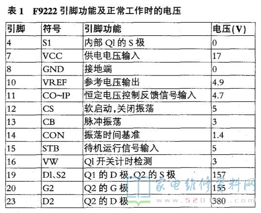 重点检查主输出开关电源这路,测量该路输出D616、D612整流管正常,没有短路现象, IC602外围元件也正常,F9222L内部集成有PWM控制电路,内含振荡稳压、驱动和大功率MOSFET开关管,可独立完成开关电压源的功能。经测量P9222L的各个引脚电压:⑦脚19V,⑧脚0V,10脚4V,11脚0v,12脚1.5V,13脚2.6V,14脚0V,15脚1V,16脚0V,19、20、23脚都为380V,说明电源IC工作异常,放电后用万用表RX1k挡测量19脚对20与23脚的电阻值时,正反向电阻均为0(指针偏向最右侧),说明此电源模块已经短路。F9222L 的19脚对20与23脚内部是MOS功率管。购回新的F9222L,它正常工作时电压如表1所示,对比测量, 证实原机F9222L短路,正常电阻值为:用指针万能表Rx1k测量19脚对20脚正向为7k,反向不通(正向即黑表笔接19脚,红表笔接20脚,反向即反接)。装上新的F9222L后通电主电源输出电压12V和24V恢复,接上假负载工作正常。上门安装好电源板通电试机正常。