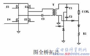 变压器的原边与谐振电感Lr, 谐振电容C1串联,与并联谐振电容C2并联。如果开关频率高于串联谐振频率,负载就像由电流源驱动。在起辉条件下,电路表现为并联负载谐振逆变器,输出表现为可调节的电压源,因而起辉电压可得到。开关管S1,S2交替导通。半桥逆变器在LCC(Lr,C1,C2)谐振频率下为ZVS操作。