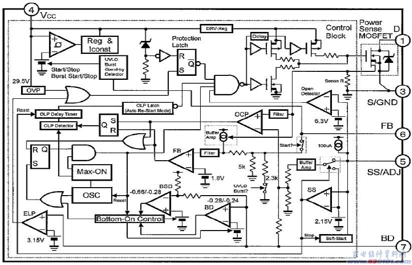 保护电路:当电源过压时,从反馈绕组反馈回来的信号经R607、ZD602、R604加到IC601的7脚,当电压超过内部比较器ELP的基准电压3.15V时比较器翻转,输出高电平经与门后送到RS触发器的S脚,关断振荡器的输出信号,电源停振。当VCC脚启动电压过压超过29.5V时,OVP过压检测电路工作输出高电平经与门送到RS触发器的S脚,同样关断振荡器的输出信号。当MOS过流时,内部检测电阻Sense R上的电压上升,经OCP比较器后输出高电平到RS触发器,经触发器后去控制振荡器工作。