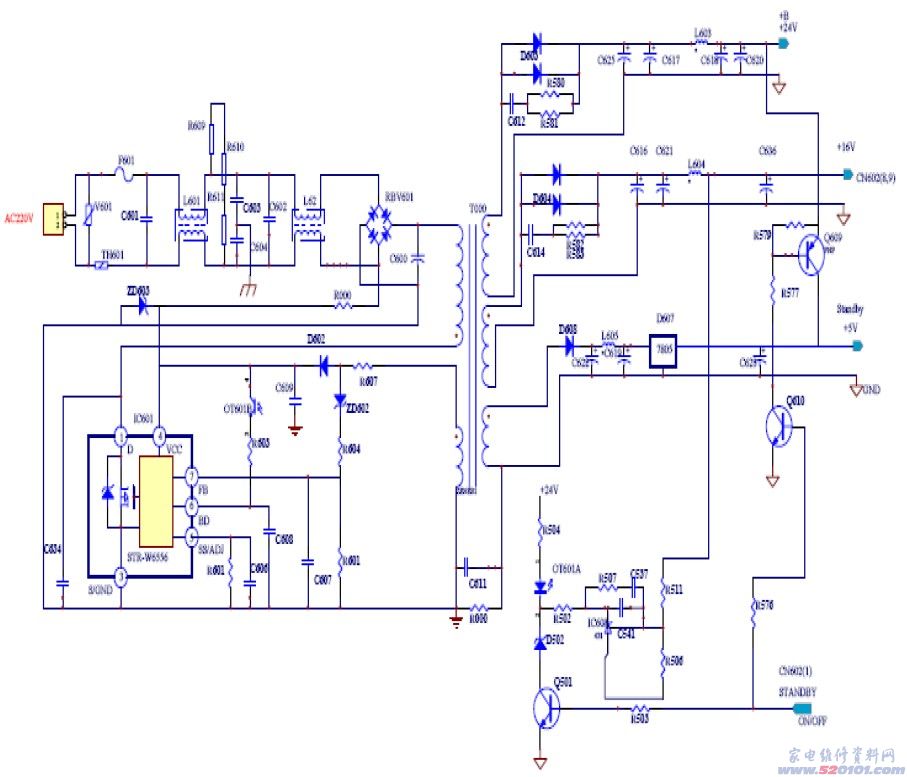 26L16机型电源板原理: 2.1 26L16机型电源板概述 26L16自产二合一电源(LIPS), 主要是配奇美(CHIMEI)V260B1的屏,采用方案把POWER和INVERTER设计在一个板上, 该电源主要输出三组电压,5V、16V、24V,5V主要给主板的CPU提供电源,16V主要给主板电路提供电源,24V给背光电路提供电源,本章主要讲解以IC STR-W6556为主的POWER电源部分的原理介绍,附图2-1、图2-2