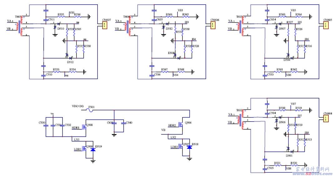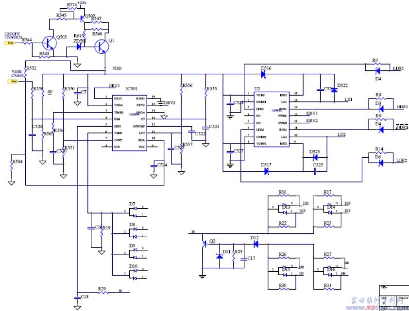 3、过压、过流电路 过压过流通过OZ9939第6脚电压来监测,在正常工作时,如果有CCFL被损坏或被移除,C511、R535、R536、D513等组成电压反馈电压,第6脚电压将升高,如果高于R550、R551设置的第7脚电压,OZ9939驱动(DRIVE)信号将被调节,同时启动OZ9939的关断信号。