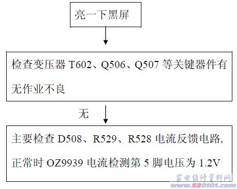 2、 开机时亮一下黑屏维修流程: 电源开机时如屏亮一下就出现黑屏,这种不良现象一般电路不正常时保护电路启动,首先要仔细检查变压器T602、Q506、Q507等关键器件有无作业不良,电流电压反馈电路有没有出现漏件,空、虚焊等,流程如下: