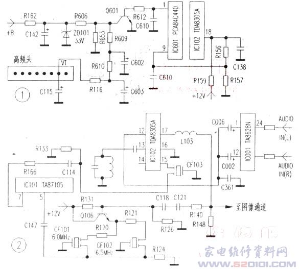 故障出现时若转换频道,原存储的节目不变,刚转换时声图正常,然后慢慢变差(失谐)。据故障时有时无的表现,似乎是虚焊引起。将有关电路的元件引脚焊点重焊,故障不变,说明不是虚焊问题。故障出现时测得加于高频头的调谐电压VT不稳,说明逃台由VT不稳产生。检测图1所示相关元件,发现CPUIC601{1}脚输出到Q601 b极的调谐控制电压也不稳。因为除逃台外,其他控制功能均正常,CPU工作应基本正常;根据逃台是慢慢发生的现象分析,AFT电压不正常的可能性最大。该机由中放块IC102{18}脚输出频率误差电压,经R156送至IC601{9}脚,通过IC601内部处理后,从{1}脚输出调谐控制电压。逃台时,测得IC102{18}脚电压为0V(正常值为5V左右),查该脚的外围元件R159、C138均正常,因此,怀疑IC102不良。用同型号的TDA8305A更换后,故障排除。