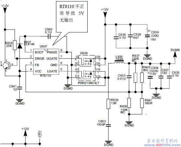 故障现象:灯亮不开机 分析与检修:通电试机发现灯亮不开机,测试电源板24V正常,3.3VSB正常,判断电源板基本无故障,测数字板DC-DC电路12V正常,但是测5V时发现才1V,测L806两端电压也是1V,说明故障范围在DC-DC电路。打开图纸DC-DC部分,测U808输出端5 V为1V不正常,分析U808是U807输入,在路测U807阻值未发现异常,于是决定更换U807(RT8110)。更换后开机测5V正常,这时开机图声正常。