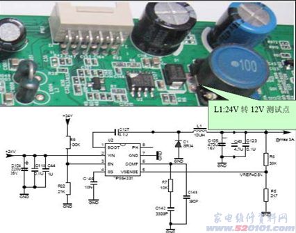 24V转12VIC是德州仪器的TPS54332在SS61,MS99等机器上使用过,它和MP1593一样是一个BUCK降压型,通过电阻分压取样来设置输出电压,第四脚为软启动,第三脚为使能脚,正常工作为高电平,第六脚为补偿,第五脚为FB反馈电压,正常工作为0.8V左右,第一脚为自举升压脚,接一个电容到续流二极管的负端。第八脚为内部MOS推挽输出接到续流二极管的负端同储能电感相连。内部MOS管导通期间向电感储能同时向负载提供供电,内部MOS管关断时电感释放能量通过二极管续流,来达到降压的目的。