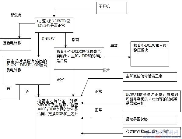 引起不开机的原因非常非常多,首先要排除各个板(电源板,主板,按键板,屏等)锁定在某个板上才能对症下药。主要有以下几种原因:供电异常,核电压,DDR参考电压,主程序异常,MBOOT程序异常,屏参不对,EEPROM数据错乱,主IC与DDR坏等等。借助串口工具,分析打印信息能帮助快速分析问题出现在那里。